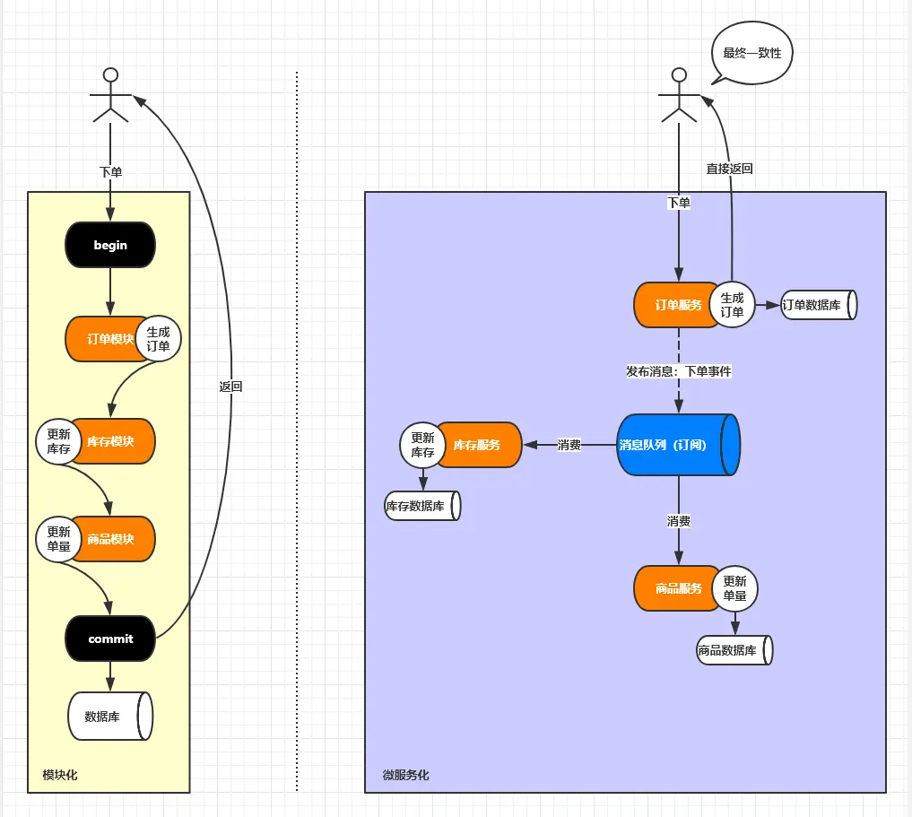 传统模块化系统强一致性vs微服务最终一致性 dakesolo 2019-09-23 213 阅读1分钟 对比 模块化 传统集成式系统,一套代码分模块处理任何逻辑需求,数据库也只用一个 微服务 将每个模块单独拿出来作为一个服务,各服务一般通过api访问,每个服务有自己的数据库 解毒 优点 减少链路深度 保证业务的一致性 DDD领域驱动设计 缺点 增加运维复杂度 每个服务多出一个事件处理模块,比如订阅哪些事件,如何对事件进行操作 不能保证实时数据一致性 需要补偿机制