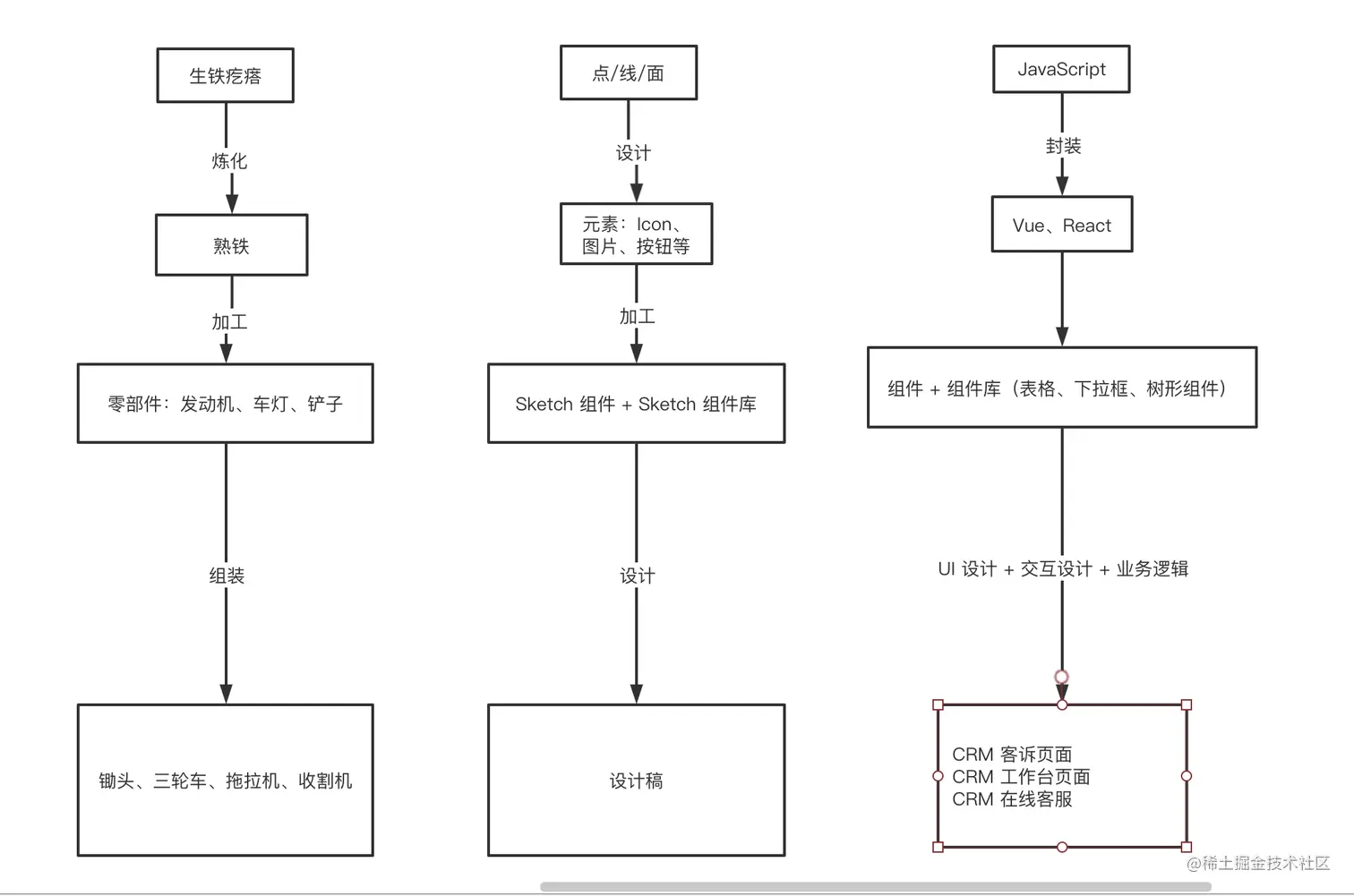 把这些零件拼接在一起,就成了拖拉机、汽车、收割机 ,极大提高了生产效率。这里的拖拉机、汽车,其实可以映射到大家的日常工作中使用的组件、元件等: