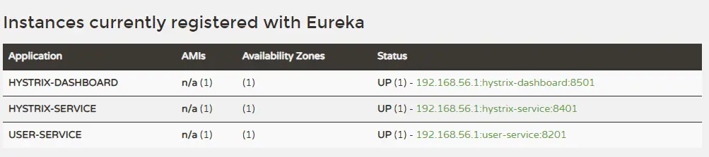 这次我们需要启动如下服务:eureka-server、user-service、hystrix-service、hystrix-dashboard,启动后注册中心显示如下。
