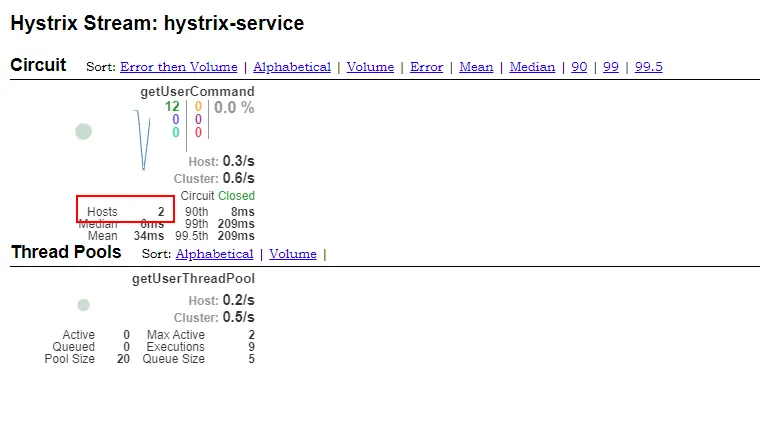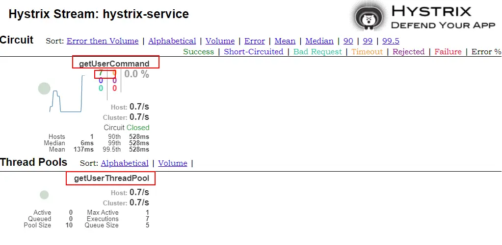 - 可以发现曾经我们在@HystrixCommand中添加的commandKey和threadPoolKey属性都显示在上面了,并且有7次调用都成功了。