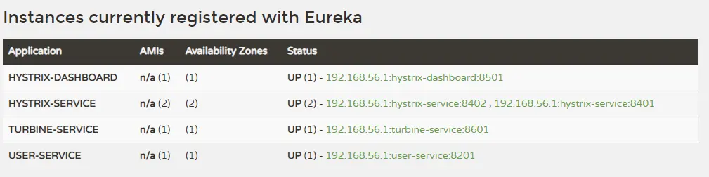 使用application-replica1.yml配置再启动一个hystrix-service服务,启动turbine-service服务,此时注册中心显示如下。