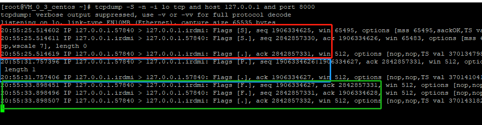 - tcpdump -S -n -i lo tcp and host 127.0.0.1 and port 8000