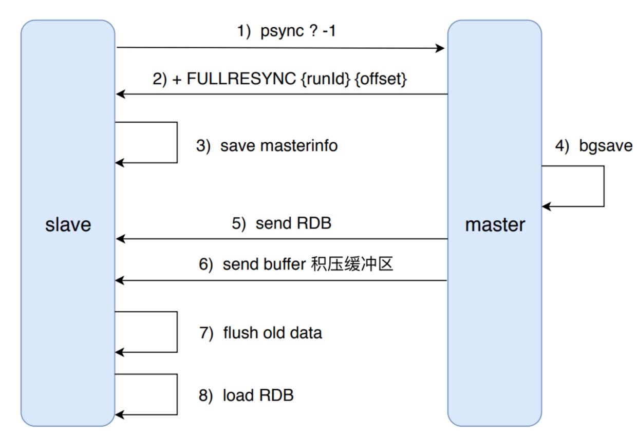 - 从节点发送 psync 命令进行数据同步,由于是第一次进行复制,从节点没有复制偏移量和主节点的运行ID,所以发送的命令时 PSYNC ? -1。