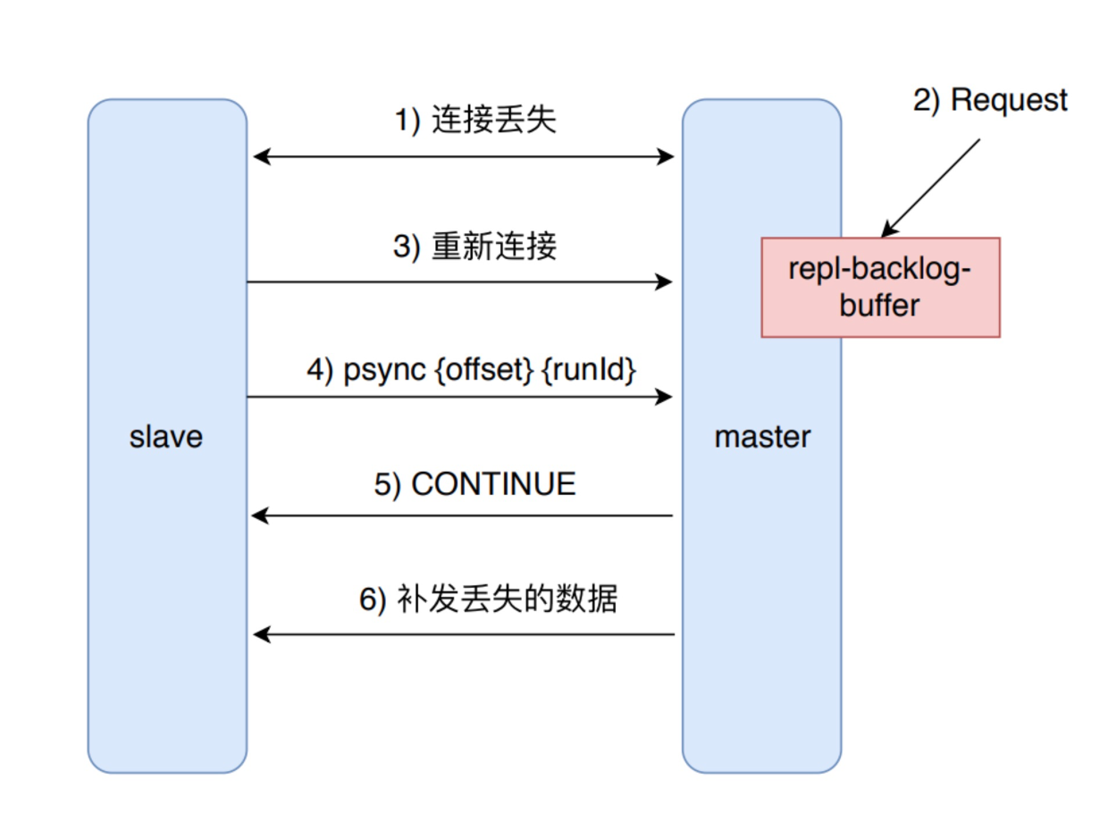 - 主节点根据偏移量把复制积压缓冲区里的数据发送给从节点,保证主从复制进入正常状态。