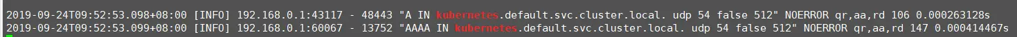 首先配置ndots为4,通过nslookup kubernetes.default.svc.cluster.local请求解析域名,查看coredns日志: