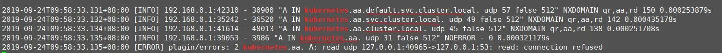 nslookup kubernetes.aa,查看coredns日志: