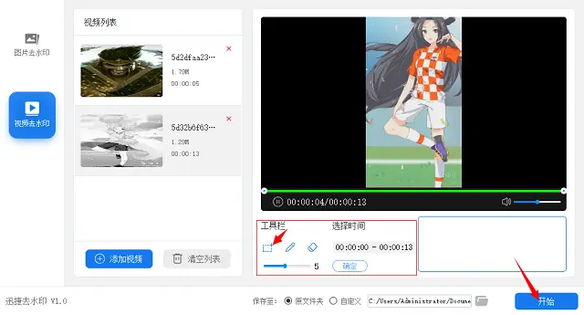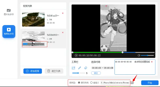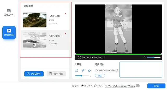 5、从视频列表中点击选择一个视频,该视频会在页面右侧显现并播放。在视频的下方还有个工具栏和选择时间栏,先选好视频中带有水印的时间段,再用工具栏里的去水印工具——矩形和画笔图案的工具覆盖视频中有水印的地方,点击一下“开始”。