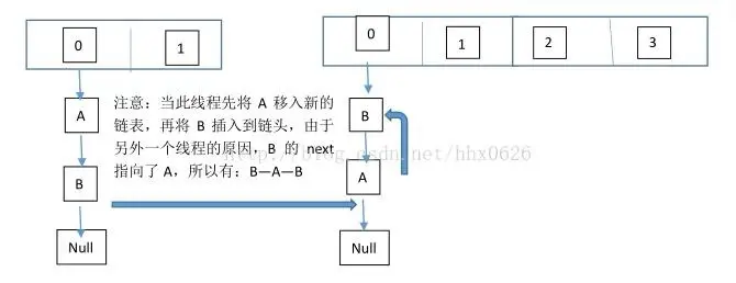 这个过程为,先将 A 复制到新的 hash 表中,然后接着复制 B 到链头(A 的前边:B.next=A),本来 B.next=null,到此也就结束了(跟线程二一样的过程),但是,由于线程二扩容的原因,将 B.next=A,所以,这里继续复制A,让 A.next=B,由此,环形链表出现:B.next=A; A.next=B
