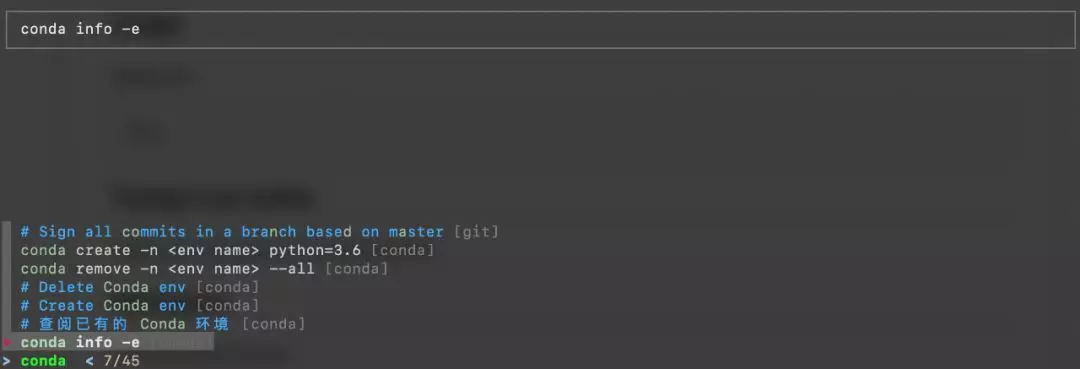 这几条都常用的 conda 命令是我们手动加入的,其中最下一行的绿色「conda」是我们键入的内容,它缩小了命令行搜索范围。最上面白框内的命令行是当前输入的内容,按确认键就会执行该命令行。