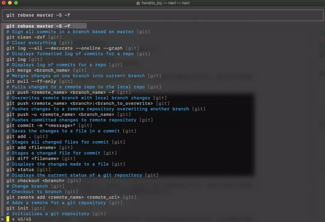 如上所示,navi 允许我们查阅所有的备忘录并执行对应的命令,值得注意的是,备忘录是实时匹配的,如果我键入 git,那么差不多就剩下 git 相关的命令行。