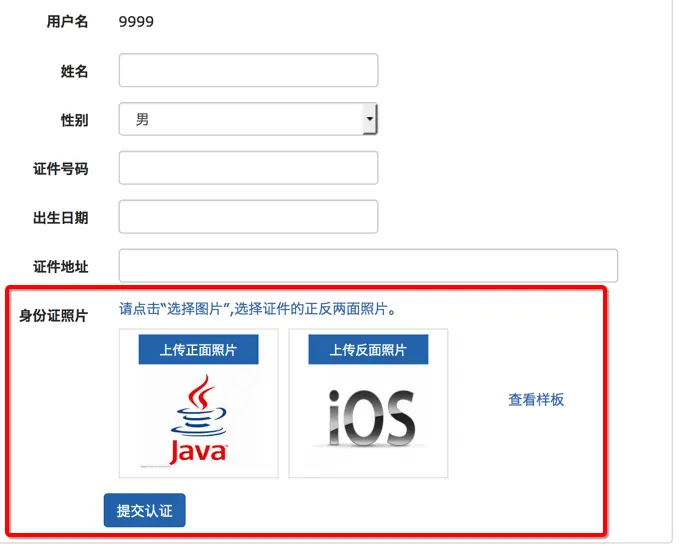 如何实现图片上传功能? 在实际应用中我们会经常遇到实名认证的功能需要上传正反面照片或者上传文件之类的,如下图