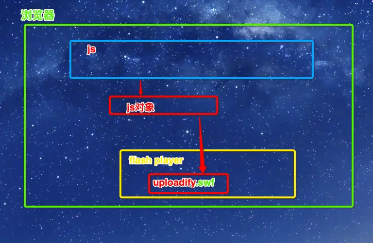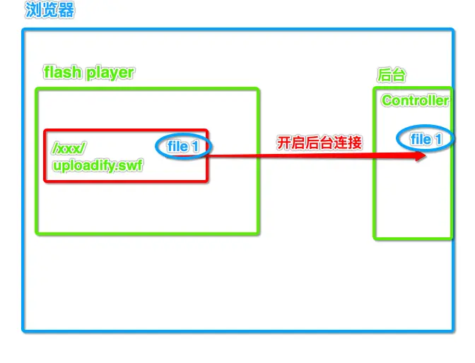 可以这么理解: 1.浏览器里嵌入一个flash player, 2.flash player里运行一个flash程序 /xxxx/uploadify.swf, 3./xxxx/uploadify.swf 这个程序单独开启一个后台连接,把我们的文件从前台传到后台
