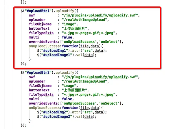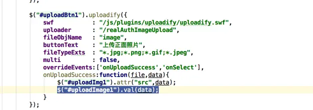 swf :flash程序地址 uploader:处理文件上传的后台地址, fileObjName:上传文件名 buttonText:选择上传文件按钮文字 fileTypeExts:上传文件的类型 multi :是否可以多选 overrideEvents:重写事件 onUploadSuccess:上传成功回调函数(回显图片) onSelect:选择文件后向队列中添加每个上传任务时都会触发(这里是重写这个方法的空方法 覆盖原有的方法不显示上传进度之类的)
