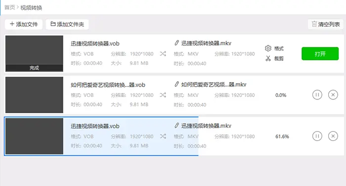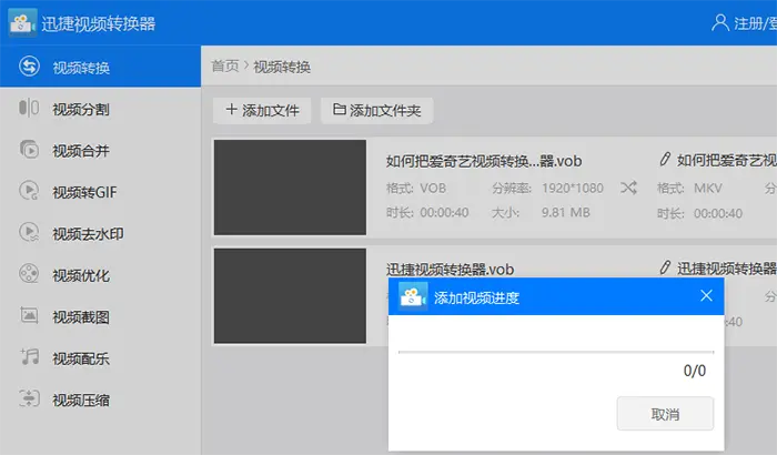 1、首先还是很正常的事情,那就是打开软件然后选择视频转换再把vob格式的文件添加到迅捷视频转换器当中,这个操作应该很简单,说明一下。可以选中vob文件然后拖拽到软件中,这应该是最快添加的方法了。还可以点击添加文件按钮选择导入文件。
