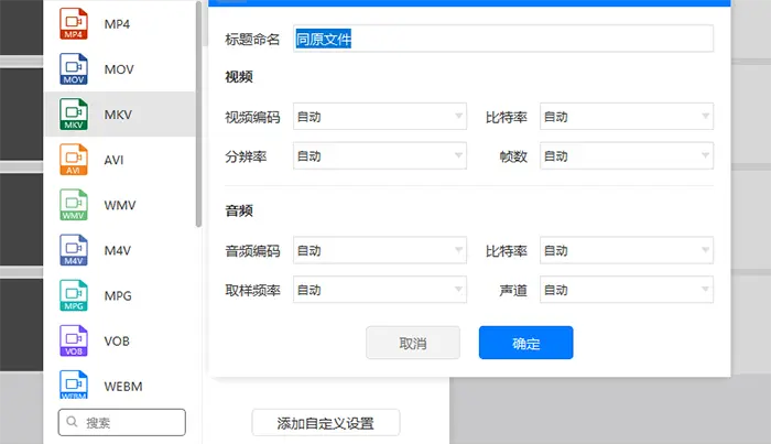 3、然后如果觉得以上提供的视频分辨率不能满足需求,那么,可以点击自定义设置,然后在自定义设置面板中选择输出视频的比特率、视频帧数和视频分辨率,当然也可以设置音频的取样频率和声道等各种参数。