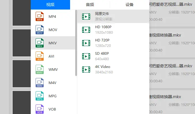 2、然后就是需要选择一个文件格式了。选择mp4视频格式作为转换输出的视频格式。那么,就可以在软件左下方的输出格式中选择mp4视频格式,mp4视频的分辨率则可以选择为1080P或者是720P等数值。