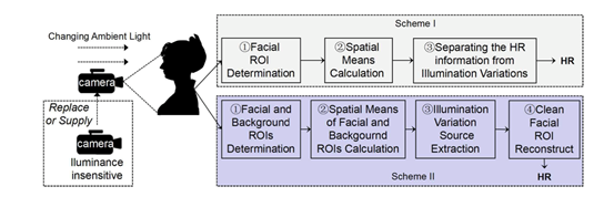 第二种方案假设分离出来的心率信号中既含有真实的血流脉搏信号,也含有光照变化带来的噪声信号。这种光照变化可以单独去不含皮肤的背景环境中检测,然后从心率信号中减去这个环境噪声信号,从而得到干净的真实心率。