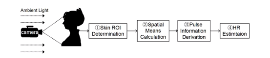 首先,在某个光源或是自然的环境光条件下,使用摄像头捕捉人脸上某个区域的皮肤数据,这个区域被称为ROI(Region of Interest),ROI可以手动挑选或是使用某些算法自动探测和追踪。其次,对采集到的ROI数据计算颜色RGB的空间均值,可以只计算某一通道,也可以计算多通道。第三,对计算出的空间均值应用信号处理方法(低通滤波、盲源分离等)得到包含心率信息的分量;最后,通常将快速傅立叶变换(FFT)或峰值检测算法应用于该分量,以估计相应的频率Fs(或处理持续时间T(s)期间的峰值数Ns)。每分钟节拍(bpm)形式下的心率将被计算为60×Fs(或Ns / T×60)。