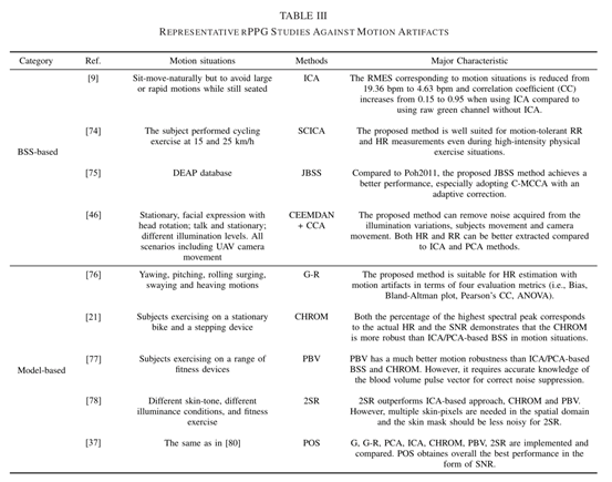 在某些特定情况的某些假设下,前面提到的某种方法都可能更合适。一般而言,目前关于rPPG研究的第一个假设是光源具有恒定的光谱成分,只是强度会发生变化,这表明光源的光谱成分的变化将是另外的挑战。在这种情况下,如果先前已知这种光谱成分的变化信息,就可以设计专门的方法来更好地测量心率。另外,传统的基于BSS的方法是将原始的平均RGB信号分离成独立的或主要的分量,没有使用任何先验信息,而通常利用颜色矢量的信息可以更好地分离信号,因此,基于模型的方法测量心率的性能通常优于传统的基于BSS的方法。此外,数据驱动的rPPG方法可以通过创建依赖于测量对象的肤色空间并跟踪色调随时间的变化来实现更好的性能。总之,包含更多准确的先验知识可以使得基于模型和基于数据驱动的rPPG方法比传统的基于BSS的方法更加鲁棒。