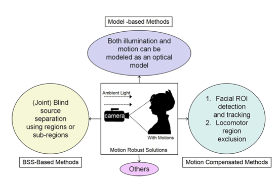 早期基于rPPG的心率检测研究基本都是在测量对象静止的情况下进行的,因为即使是轻微的运动都会造成ROI和摄像头、光源之间的距离和角度发生变化,从而带来更大的干扰和噪声。但现实场景下检测对象不可能一直保持这种理想条件,因此越来越多的研究开始关注如何去克服运动带来的影响。相关的研究也可分为下面这几类: