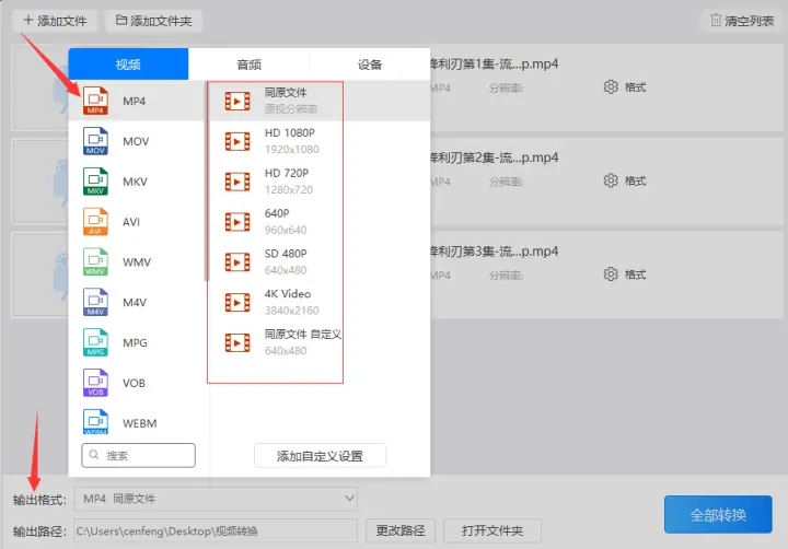 3、之后在输出格式中设置好输出的视频格式和视频分辨率,其中要注意的就是把视频格式设置为需要转换的mp4格式,而分辨率可以根据需求调整参数。
