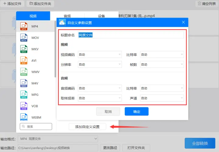 4、如果想更改软件预设的参数可以点击添加自定义设置按钮设定视频的视频编码、比特率、分辨率、帧数和音频的音频编码、取样频率、比特率、声道的参数。