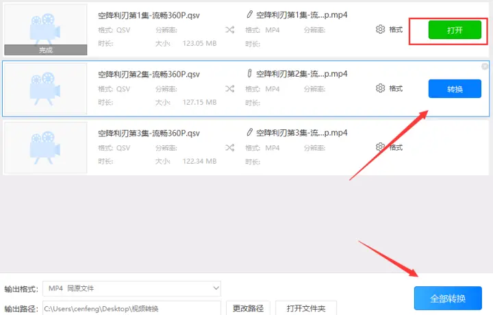 5、最后点击转换按钮就可以把qsv格式转成mp4了,而转换好视频后只需点击覆盖在转换按钮上的打开按钮就可以找到转换后的mp4格式的视频了。