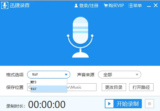 2、在“格式选择”里选择要录制的音频格式,我选择的是WAV格式(无损音乐格式)。