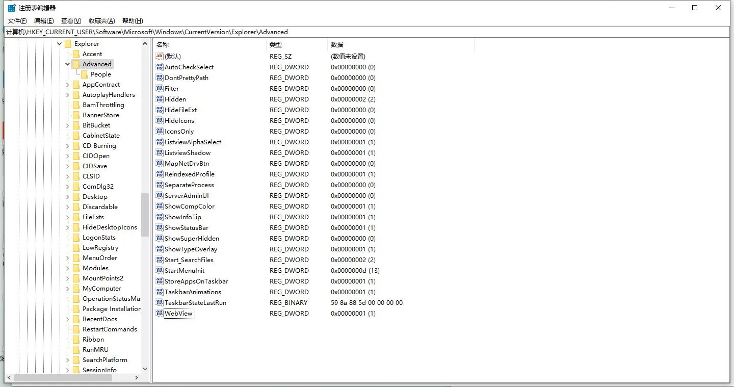 \HKEY_CURRENT_USER\Software\Microsoft\Windows\CurrentVersion\Explorer\Advanced - 之后, 在空白处鼠标右键