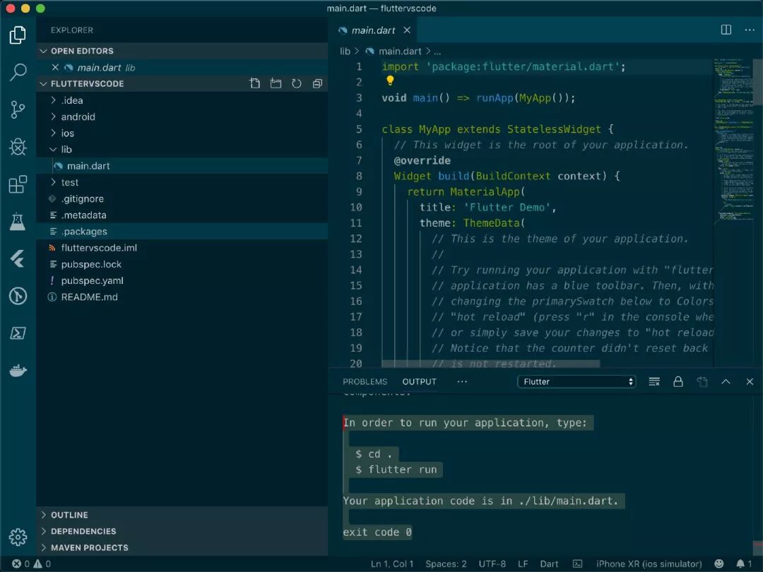 然后切换到终端,执行 flutter run ,就能跑起项目来啦!(我开着 iOS 模拟器)