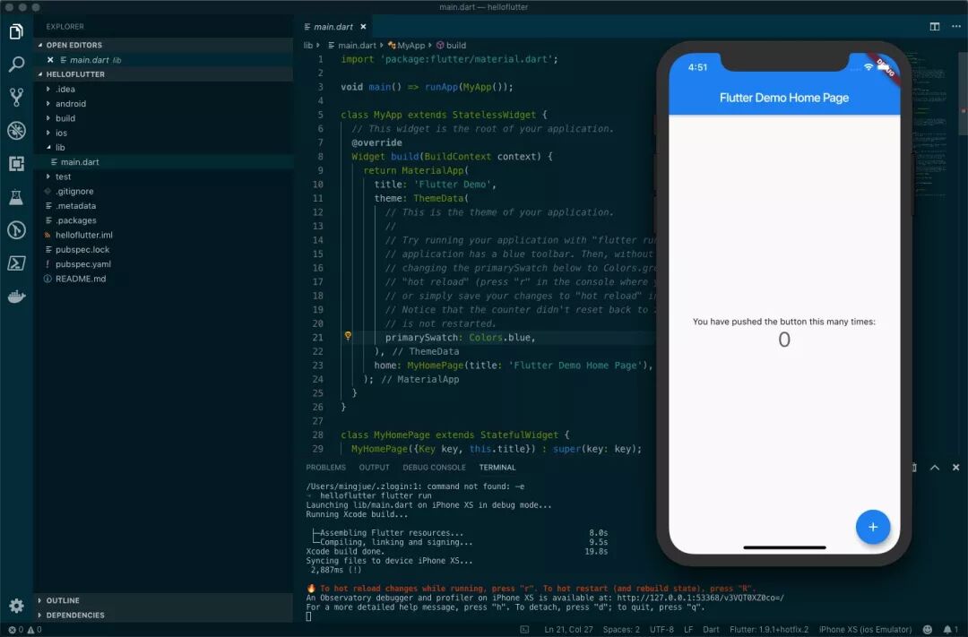 打开最开始创建的 helloflutter 项目,执行 flutter run 就能运行起来啦!