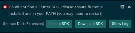 这个比较奇怪,我明明配置了环境变量但是还是提示我找不到,看了下 Show Log 发现跟我配置的不太对,东西少了很多,想了想可能是因为我没有配置VS 的终端,它默认用的是 bash 不是 zsh,所以没找到我配置在 zsh 的 flutter。