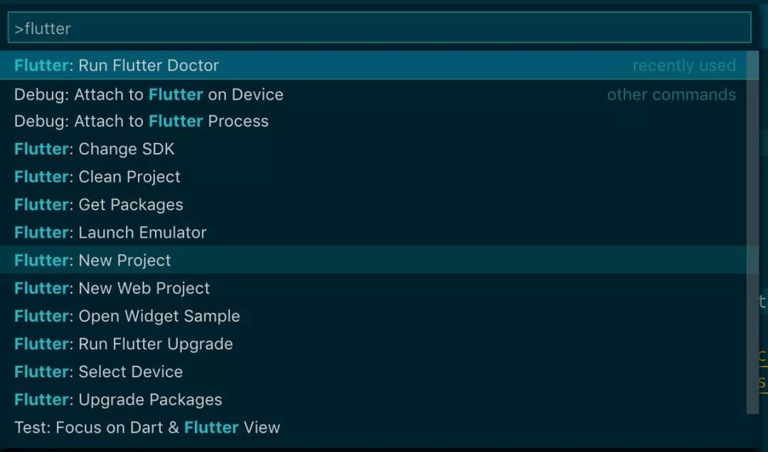 在 command palette 输入 flutter , 找到 New Project 并执行,输入工程名后会自动创建工程。