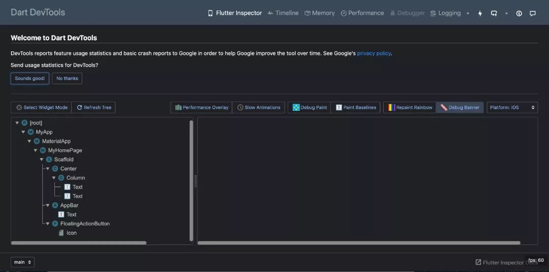 当一切就绪,可以通过底部打开一个Dart DevTools 的网页,展示一些 App 的信息: