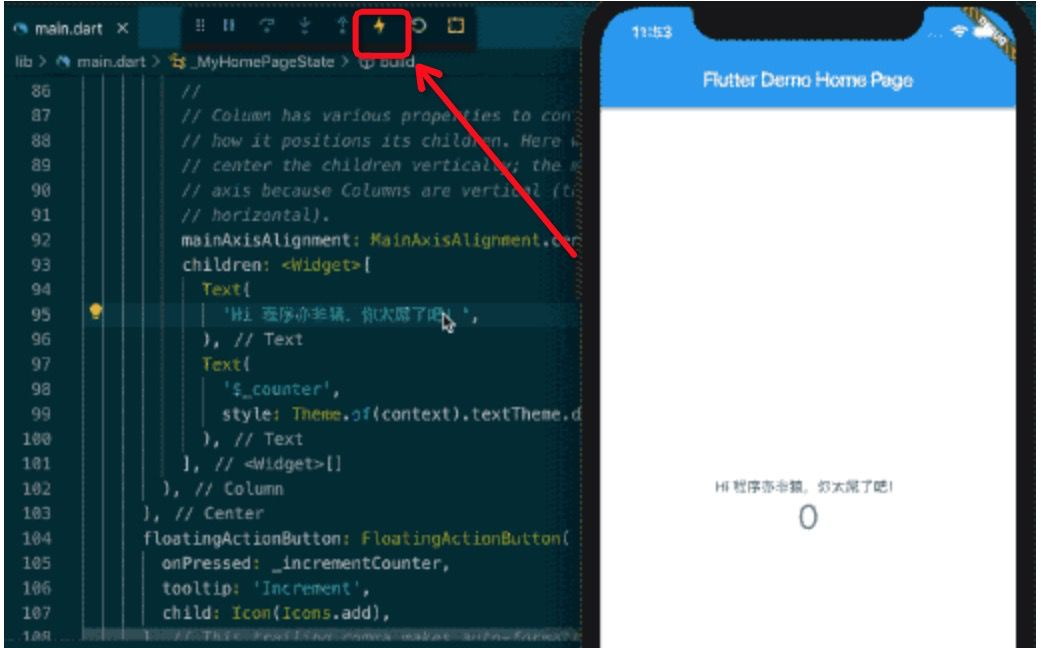 尝试修改 Demo 里的 Text 组件,command + S 保存, 这修改就能直接表现到模拟器上。(或者点击那个闪电)