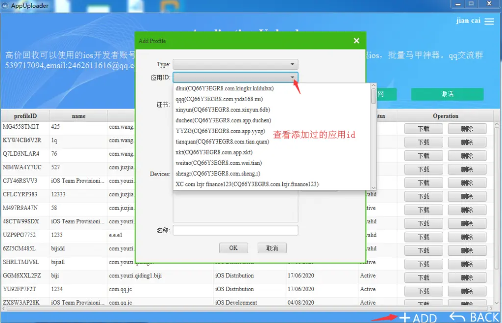 点击右下角+ADD,在应用id项,点击下拉三角符号即可看到以前加过的记录!