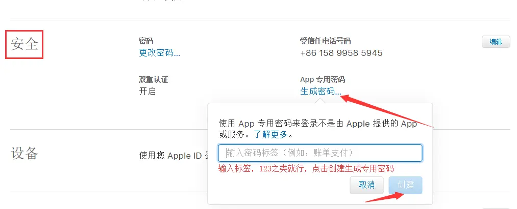 点击创建生成,(注意密码标签不是专用密码,是由苹果系统生成的一串密码)专用密码就是下面这个样子的密码,把这个密码复制,打开Appuploader