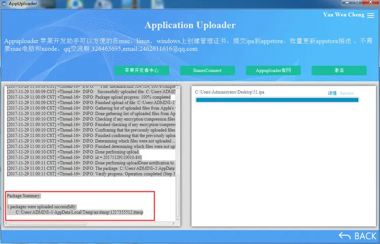 5.5Appuploader将自动上传你的IPA,包如果很大需要上传一段时间,当出现以下提示时(packages were uploaded successfully 进度条蓝色),说明上传成功。