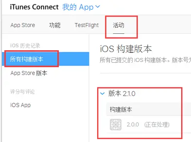 进入APP,点击活动,所有构建版本选项(下图所示),这里会显示上传成功的构建版本,如果ipa包没问题刚上传会显示正在处理!