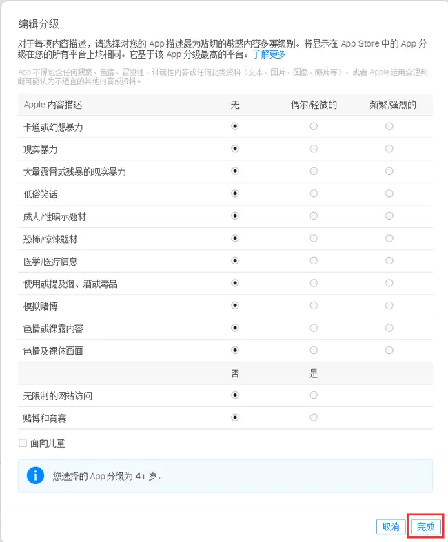 7.7、分级选项根据自己的app情况选择。