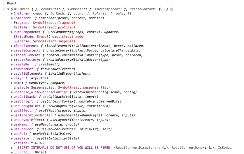 在浏览器控制台中打印出React的值,可以看到React是一个对象,有很多的属性。