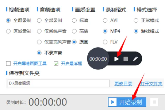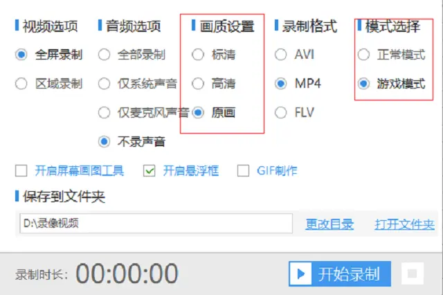 2、找到之后打开这个工具,会有一个带有录屏功能的面板出现在屏幕上。在面板中还有一些录制游戏视频需要设置的一些参数,如视频、音频、画质、格式和模式。这里模式就选择游戏模式,画质最好是原画画质。