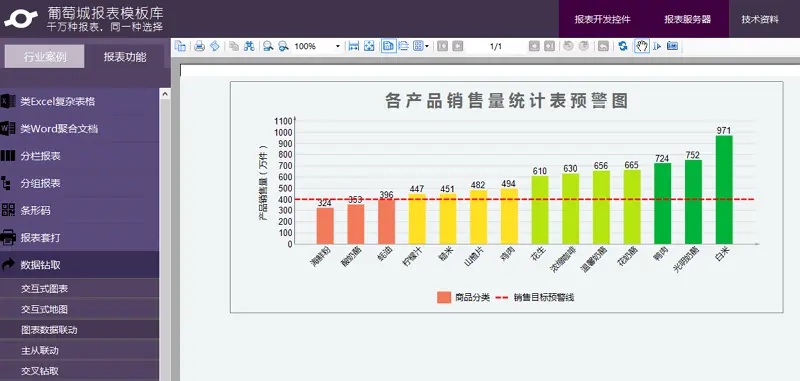 如下图中的“各产品销售量统计表预警图”,从图中可以明确的看到哪些商品的销售达到了销售量预期。