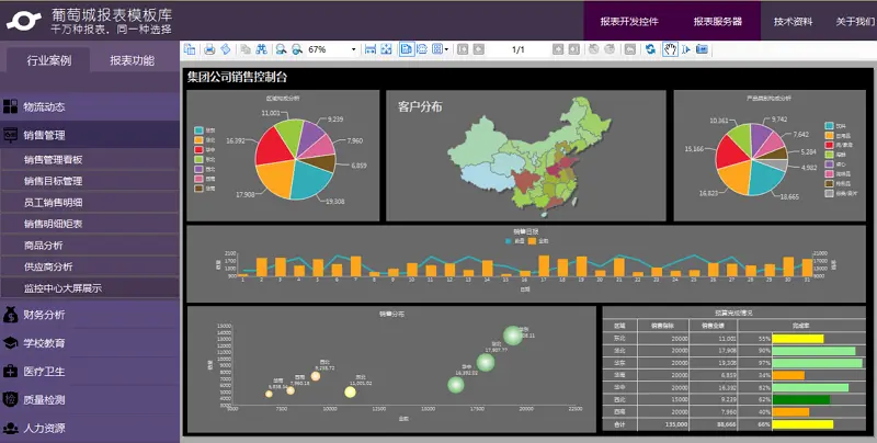 如下图中的“销售控制台”,从图中可以分析出“区域销售构成”、“客户分布情况”、“产品类别构成”和“预算完成情况”等信息。
