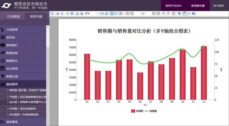 如下图中的“销售额和销售量”,可以分析出全面的销售量和销售额基本呈上升趋势,借此可推断明年的基本销售趋势。