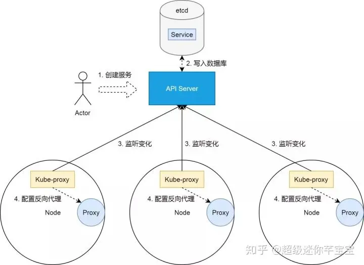 在这里把服务照进反向代理这个现实的,是 Kubernetes 集群的一个控制器,即 kube-proxy。关于 Kubernetes 集群控制器的原理,请参考我另外一篇关于控制器的文章。简单来说,kube-proxy 作为部署在集群节点上的控制器,它们通过集群 API Server 监听着集群状态变化。当有新的服务被创建的时候,kube-proxy 则会把集群服务的状态、属性,翻译成反向代理的配置。
