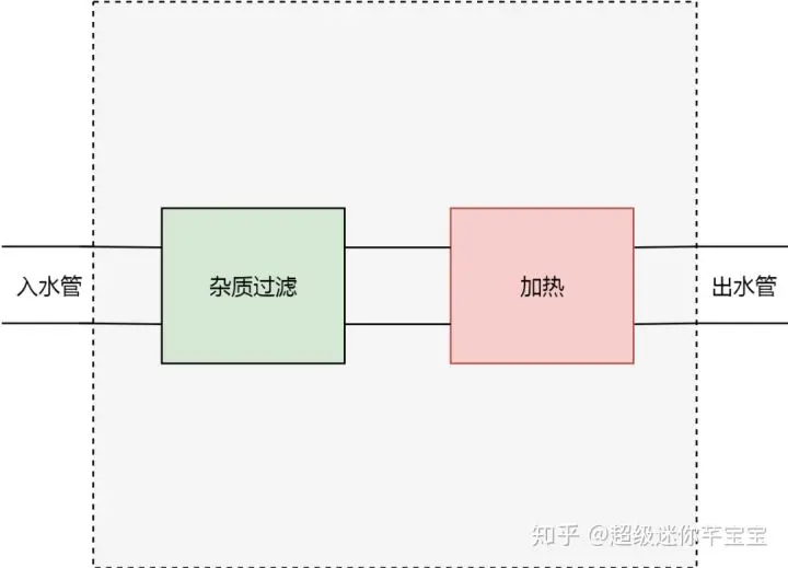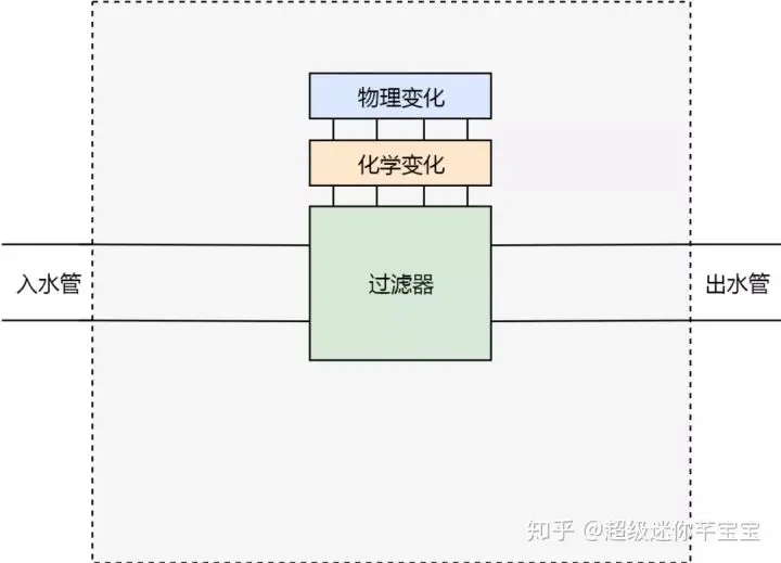现在,我们来设想一种场景。我们有一个屋子。这个屋子有一个入水管和出水管。从入水管进入的水,是不能直接饮用的,因为有杂质。而我们期望,从出水管流出的水,可以直接饮用。为了达到目的,我们切开水管,在中间加一个杂质过滤器。