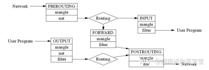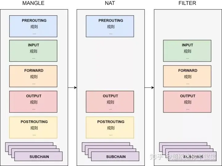 把过滤功能和管道解耦之后,所有对数据包的处理,都变成了对表的配置。而管道上的5个切口,仅仅变成了流量的出入口,负责把流量发送到过滤中心,并把处理之后的流量沿着管道继续传送下去。