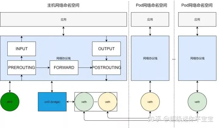 在网络设备这一层,我们通过 cni0 虚拟网桥,组建出系统内部的一个虚拟局域网。Pod 网络通过 veth 对连接到这个虚拟局域网内。cni0 虚拟局域网通过主机路由以及网口 eth0 与外部通信。