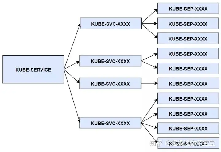 集群服务的反向代理,实际上就是利用自定义链,模块化地实现了数据包的 DNAT 转换。KUBE-SERVICE 是整个反向代理的入口链,其对应所有服务的总入口;KUBE-SVC-XXXX 链是具体某一个服务的入口链,KUBE-SERVICE 链会根据服务 IP,跳转到具体服务的 KUBE-SVC-XXXX 链;而 KUBE-SEP-XXXX 链代表着某一个具体 Pod 的地址和端口,即 endpoint,具体服务链 KUBE-SVC-XXXX 会以一定算法(一般是随机),跳转到 endpoint 链。